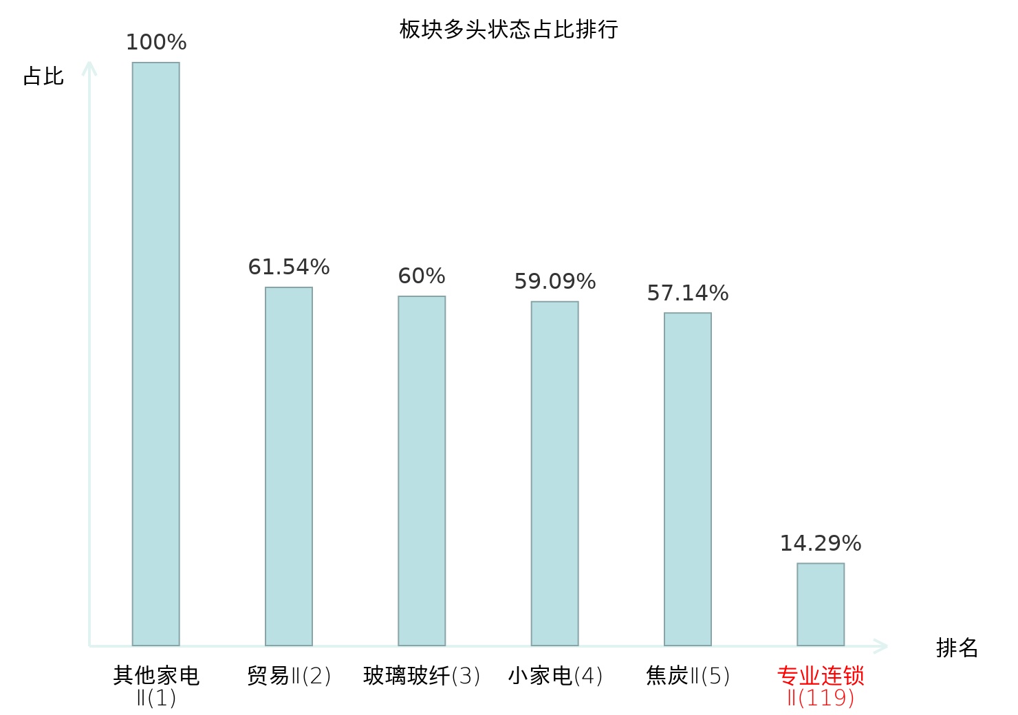 全市场所有行业板块中主力多头状态占比排名中,其他家电Ⅱ板块位居第一。摩托车及其他板块名次提升最快,较昨日上升76位。