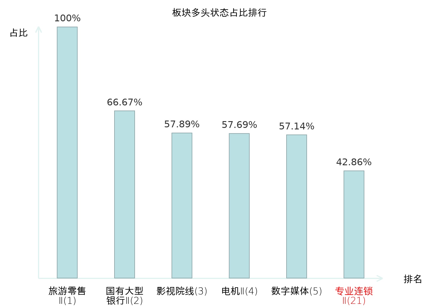 全市场所有行业板块中主力多头状态占比排名中,旅游零售Ⅱ板块位居第一。专业连锁Ⅱ板块名次提升最快,较昨日上升56位。
