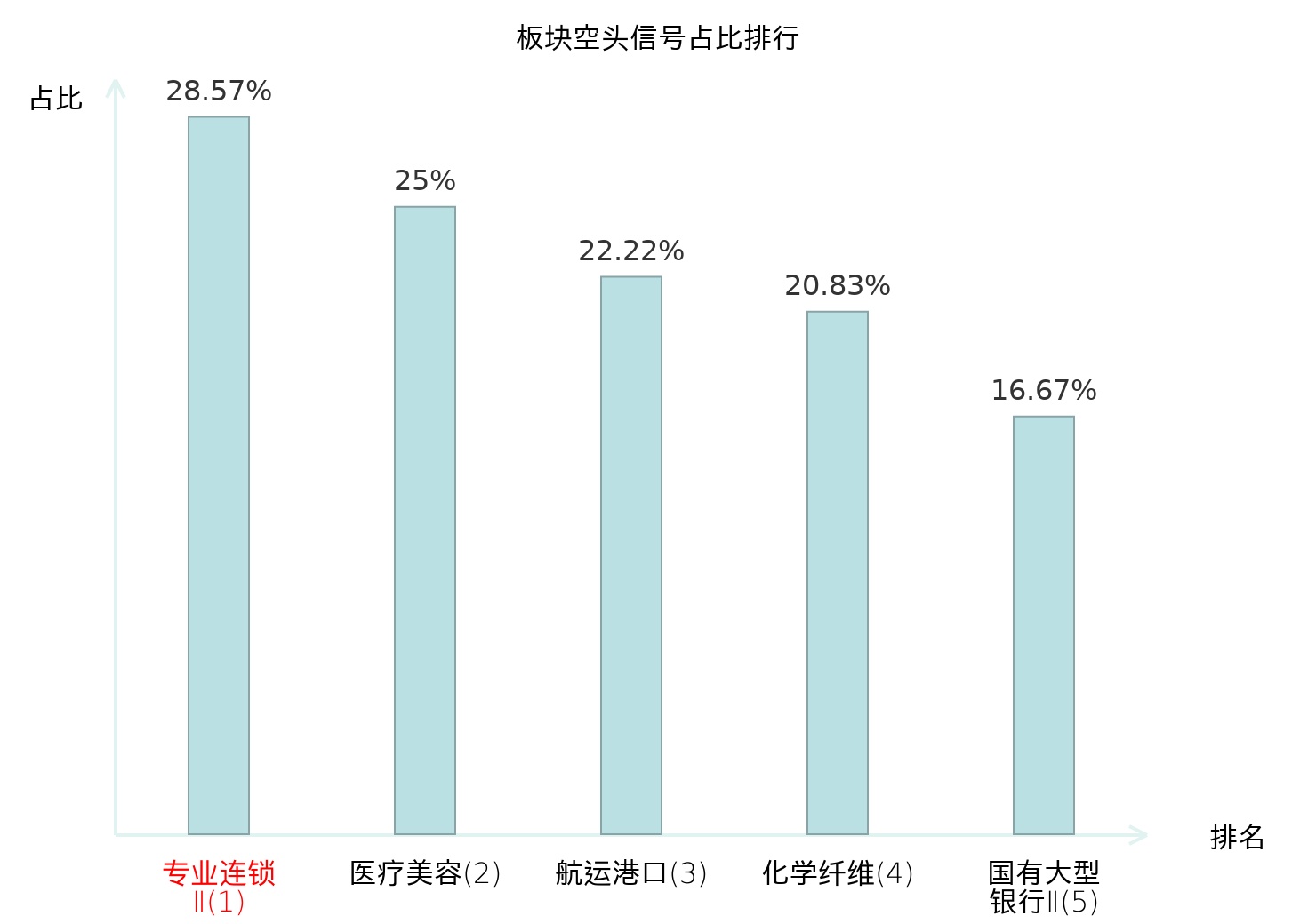 全市场所有行业板块中主力空头信号占比排名中,专业连锁Ⅱ板块位居第一。食品加工板块名次提升最快,较昨日上升106位。