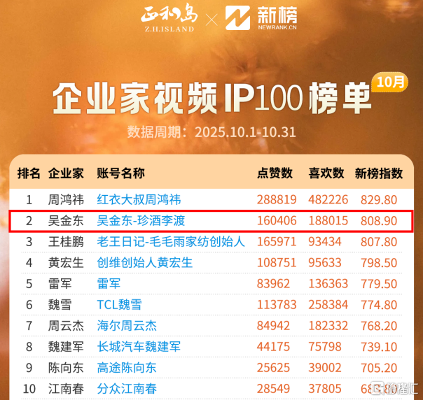 他的视频号也获得了权威认可。近日,正和岛联合新榜发布的《企业家视频IP100榜单(10月)》显示,吴向东视频号"吴金东—珍酒李渡"影响力位列第二。该榜单包括360集团创始人周鸿祎、小米集团创始人兼董事长雷军、海尔集团董事局主席周云杰等知名商业领袖。