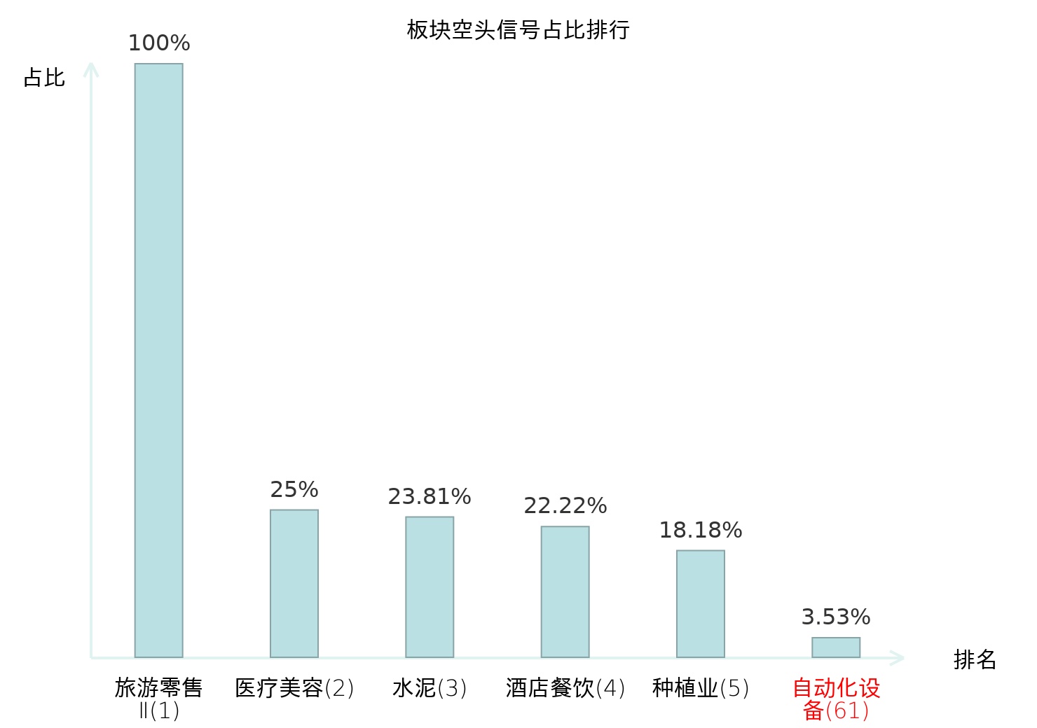 全市场所有行业板块中主力空头信号占比排名中,旅游零售Ⅱ板块位居第一。装修建材板块名次提升最快,较昨日上升112位。