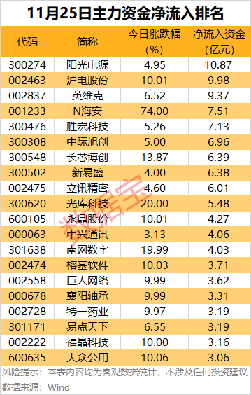 阳光电源主力资金净流入10.87亿元,居首。今日光伏板块大幅反弹,阳光电源涨4.95%,德福科技涨超8%,罗博特科涨超5%。