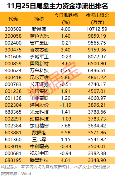 尾盘主力资金净流出方面,新易盛尾盘主力资金净流出超1亿元;蓝色光标、省广集团、香农芯创、长城军工尾盘主力资金净流出均超8000万元。