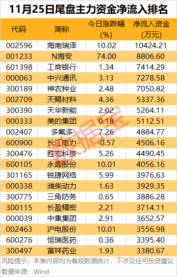 个股方面,海南瑞泽尾盘主力资金净流入1.04亿元,居首;N海安、工商银行、中兴通讯、神农种业尾盘主力资金净流入均超7000万元。