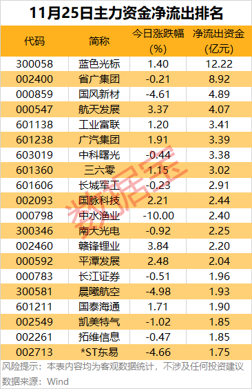 今日有63股主力资金净流出均超1亿元,其中,蓝色光标、省广集团、国风新材、航天发展、工业富联、广汽集团等热门股净流出金额均超3亿元。