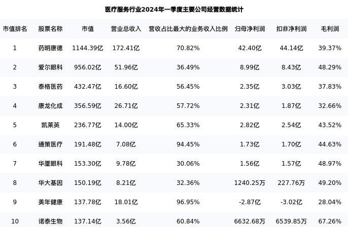 康龙化成最新报告期数据为一季度,下表汇总了医疗服务行业内市值靠前的公司一季度主要经营数据
