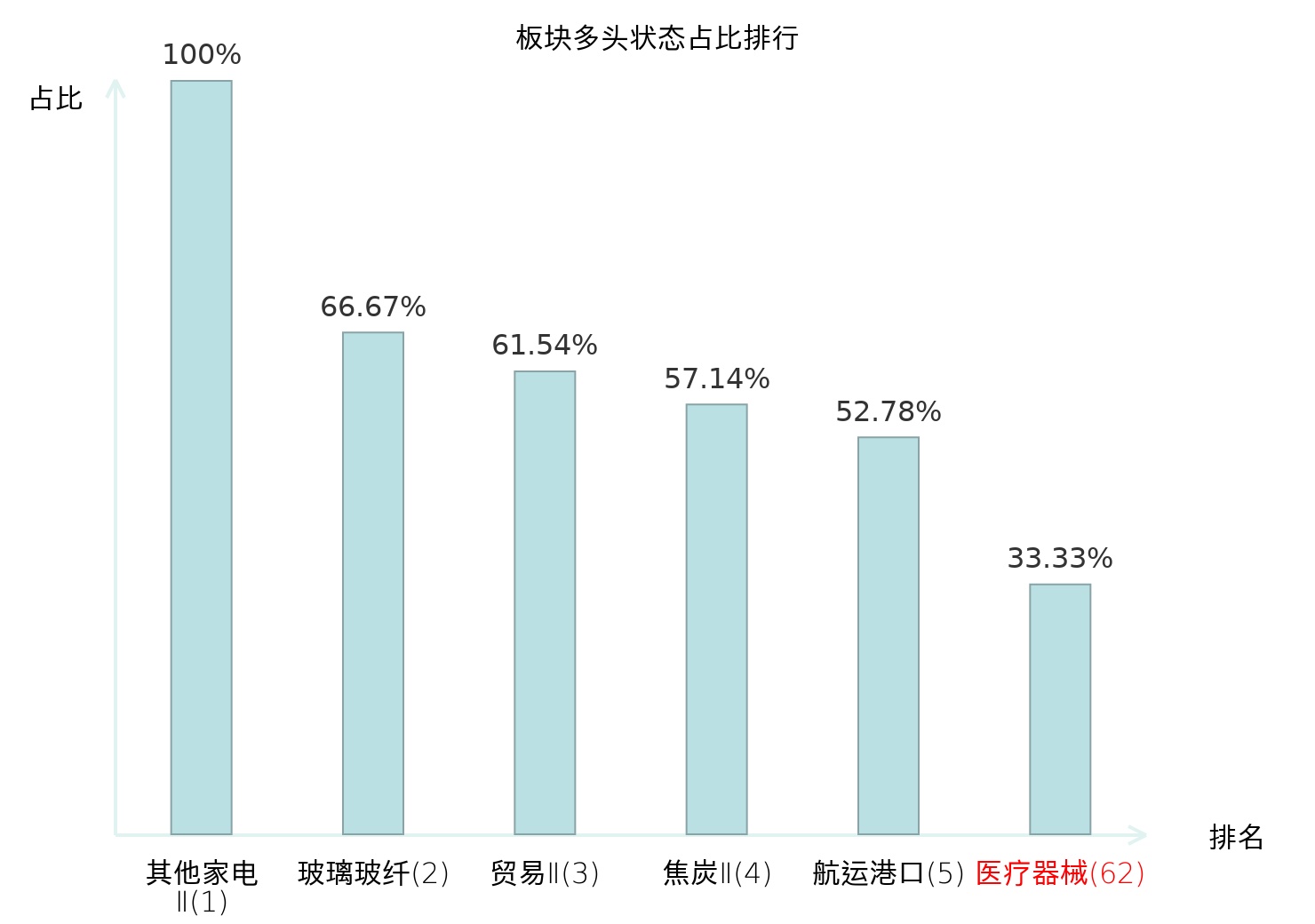 全市场所有行业板块中主力多头状态占比排名中,其他家电Ⅱ板块位居第一。影视院线板块名次提升最快,较昨日上升62位。