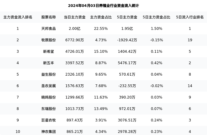 从主力资金流向来看,养殖业行业今日主力资金流入24.01亿元,在所有申万二级行业中排名:61/131。