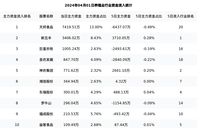 从主力资金流向来看,养殖业行业今日主力资金流入20.19亿元,在所有申万二级行业中排名:124/131。