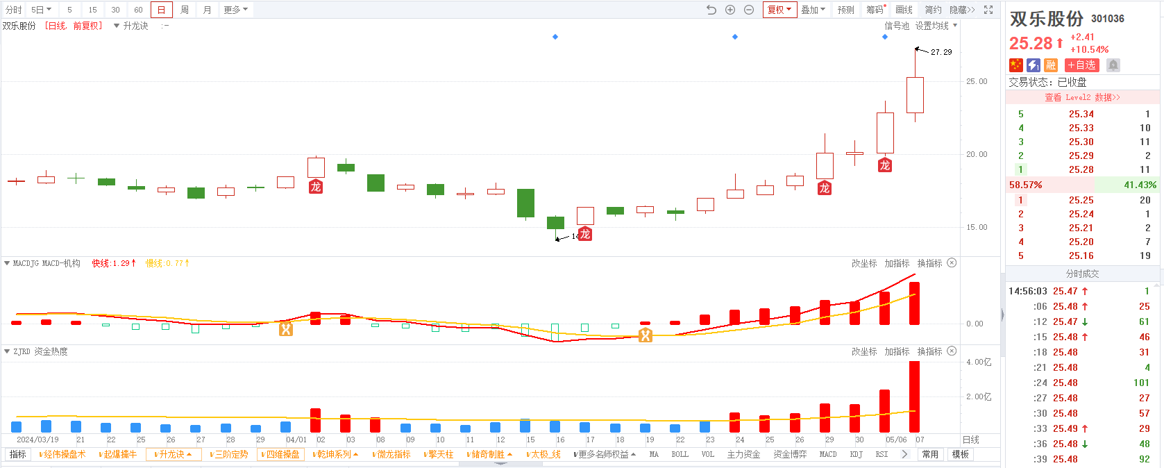 3)参考技术指标:双乐股份-升龙诀指标-出现龙信号