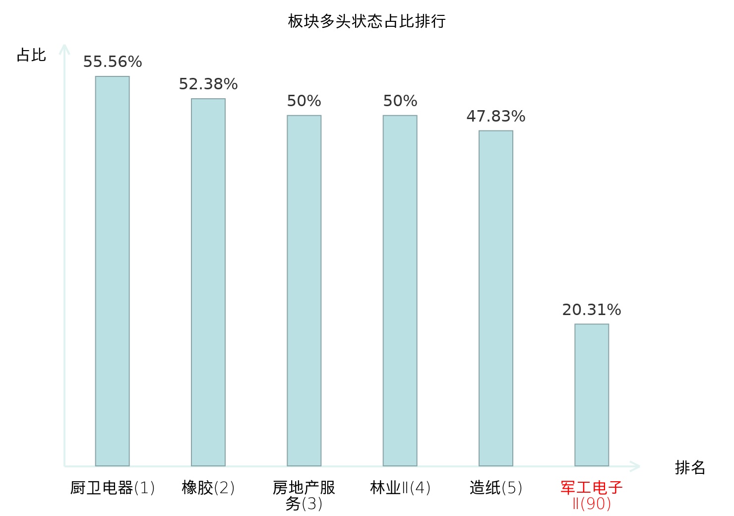全市场所有行业板块中主力多头状态占比排名中,厨卫电器板块位居第一。贵金属板块名次提升最快,较昨日上升73位。