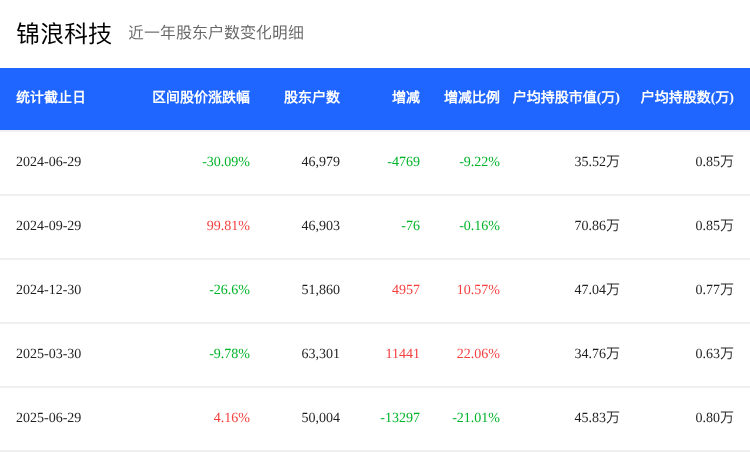 截止2025年6月30日,锦浪科技(300763)的股东户数为5.00万,相比上期减少了21.01%。户均持股数量环比增长了26.59%,达到了45.83万元,户均持股市值环比增长了31.85%。股东户数的减少和户均持股数的增加,表明投资者趋向集中,可能意味着机构投资者或大户的持股比例上升,而小散持股比例下降。