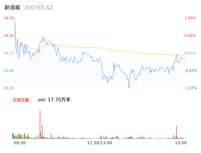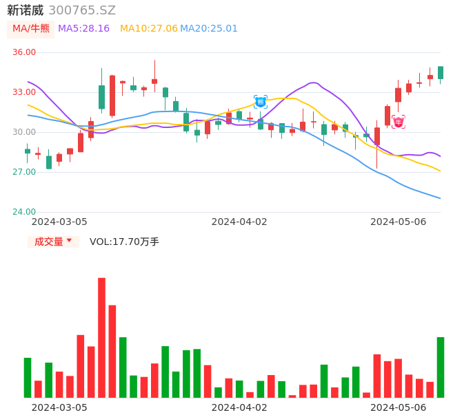 05月06日,新诺威收报34.01,股价涨幅-0.76%,成交金额6.06亿元,换手率1.42%。