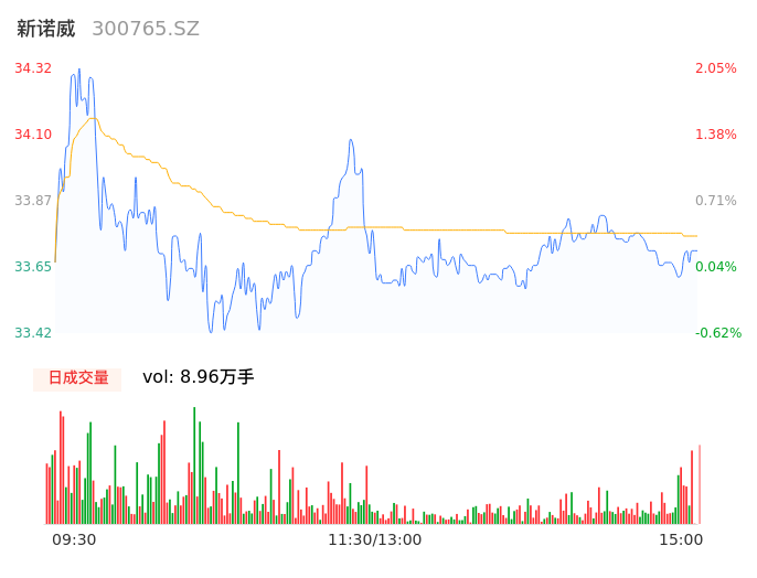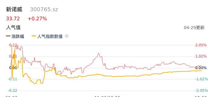 04月29日,新诺威收报33.72,股价涨幅0.27%,成交金额3.02亿元,换手率0.72%。
