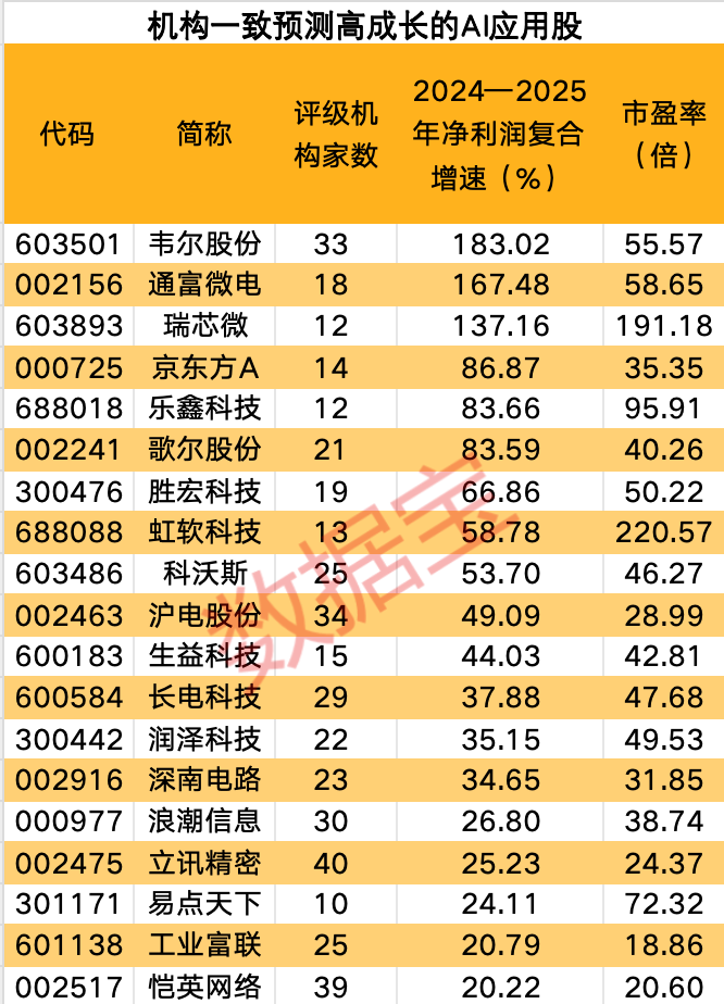 据证券时报·数据宝统计,在2024年前三季度净利润增长或2024年业绩预增的AI应用概念板块上市公司中,截至2月8日(下同),机构评级家数超10家且一致预测2024—2025年净利润复合增速超20%的个股有19只,这些公司分布在AI应用产业链的不同环节,从芯片设计、封装测试、传感器、PCB、服务器制造,到数据中心、算法应用和终端产品。