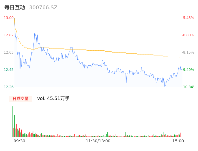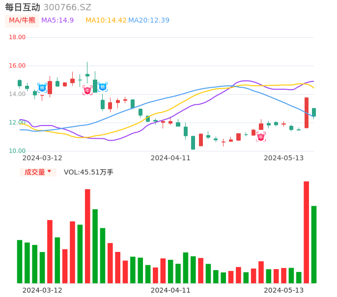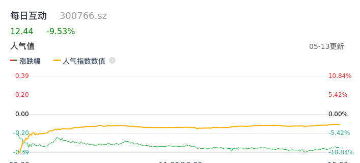 05月13日,每日互动收报12.44,股价涨幅-9.53%,成交金额5.72亿元,换手率12.56%。
