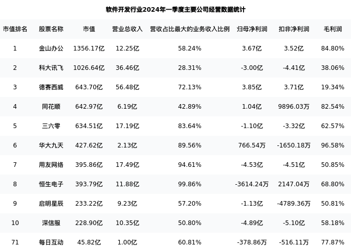 每日互动最新报告期数据为一季度,下表汇总了软件开发行业内市值靠前的公司一季度主要经营数据