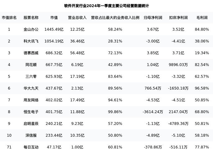 每日互动最新报告期数据为一季度,下表汇总了软件开发行业内市值靠前的公司一季度主要经营数据