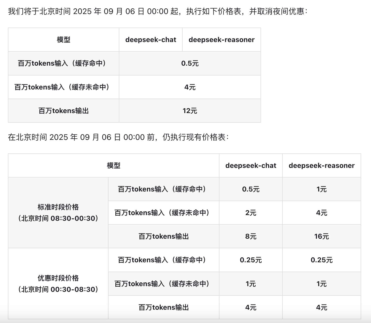 值得注意的是,DeepSeek此次还宣布,将于9月6日凌晨起对DeepSeek开放平台API接口调用价格进行调整,并取消夜间时段优惠。9月6日前,所有API服务仍按原价格政策计费。