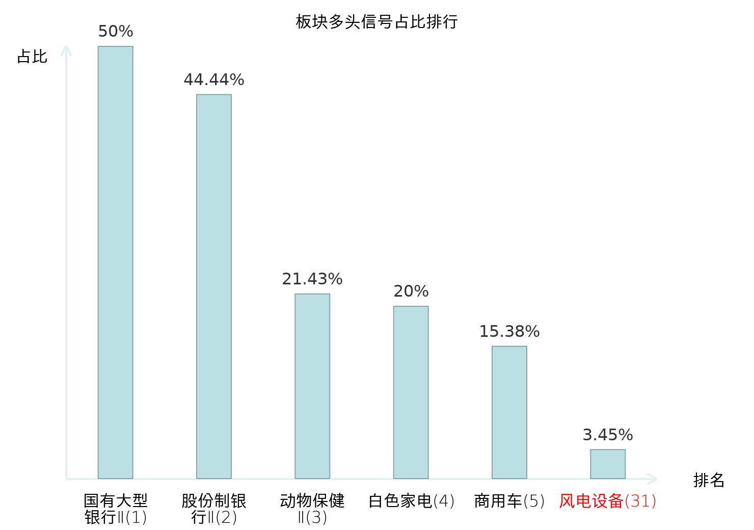 全市场所有行业板块中主力多头信号占比排名中,国有大型银行Ⅱ板块位居第一。房屋建设Ⅱ板块名次提升最快,较昨日上升114位。