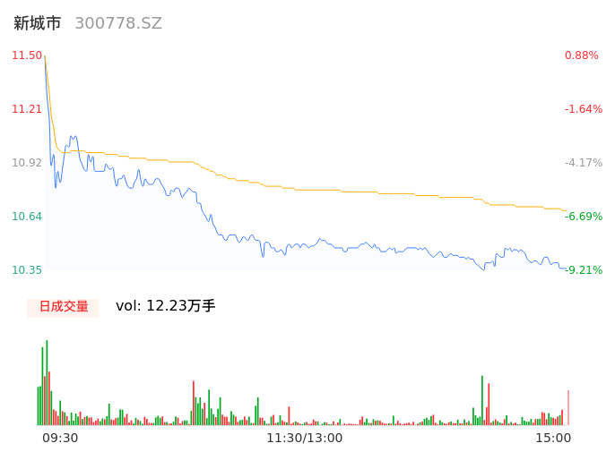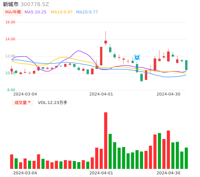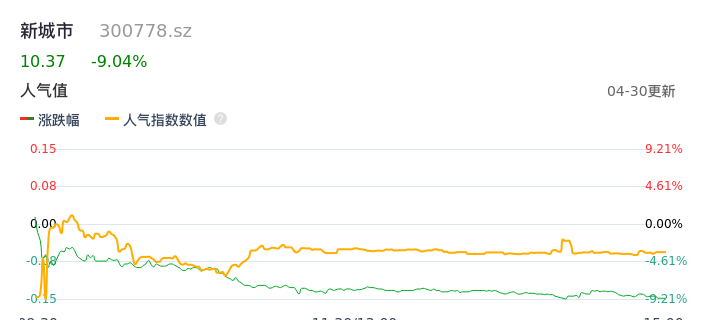 04月30日,新城市收报10.37,股价涨幅-9.04%,成交金额1.30亿元,换手率6.00%。