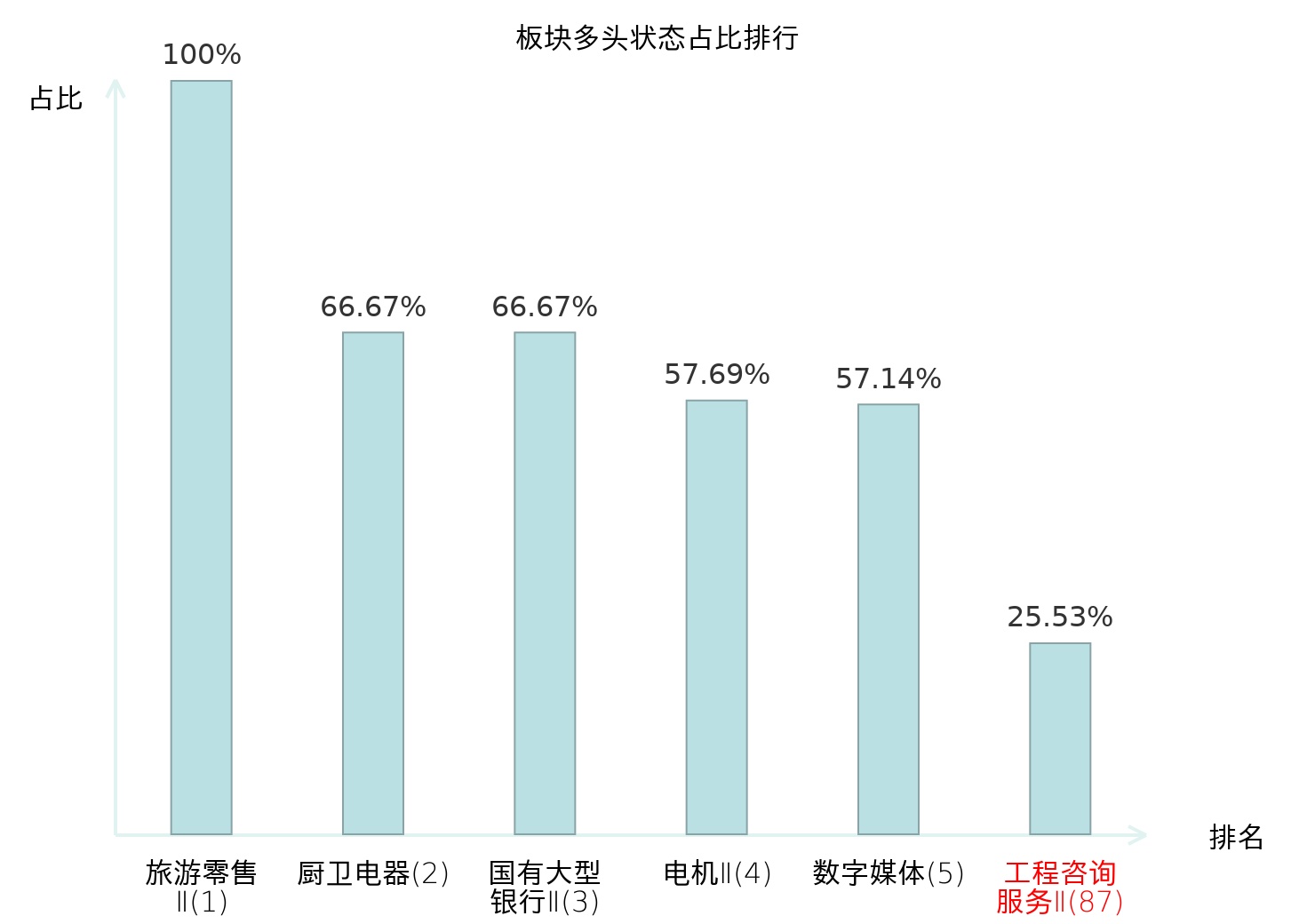 全市场所有行业板块中主力多头状态占比排名中,旅游零售Ⅱ板块位居第一。汽车服务板块名次提升最快,较昨日上升70位。