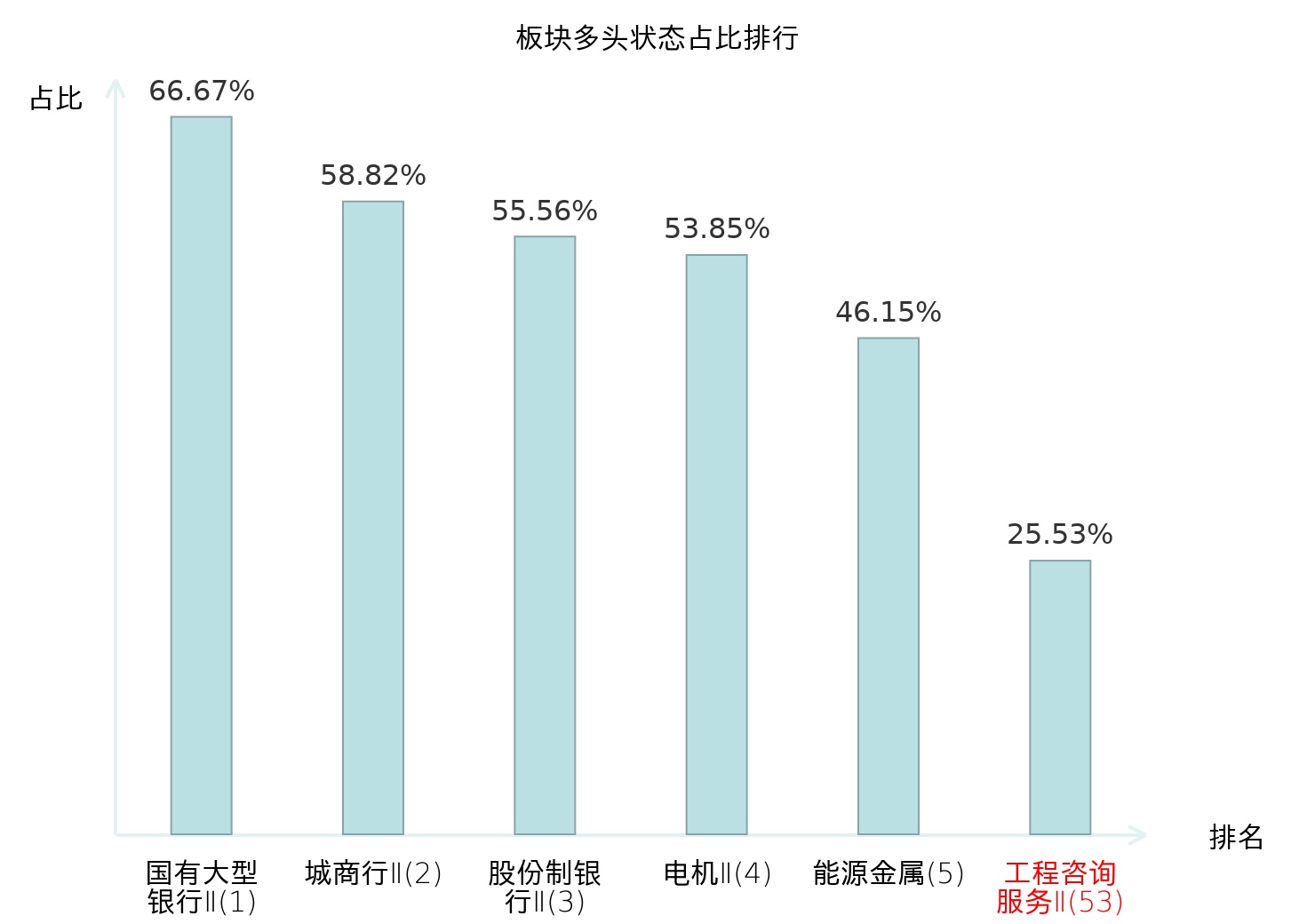 全市场所有行业板块中主力多头状态占比排名中,国有大型银行Ⅱ板块位居第一。自动化设备板块名次提升最快,较昨日上升57位。