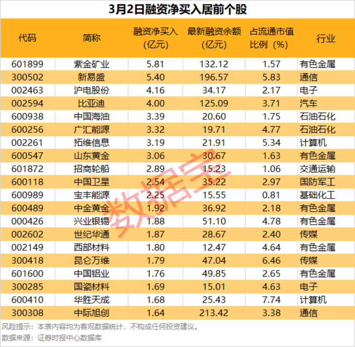 具体到个股,3月2日共有1949只股获融资净买入,净买入金额在1亿元以上的有44股,其中8股融资净买入额超3亿元。紫金矿业融资净买入额居首,当日净买入5.81亿元;其次是新易盛、沪电股份,融资净买入金额分别为5.40亿元、4.16亿元;融资净买入金额居前的还有比亚迪、中国海油、广汇能源等。