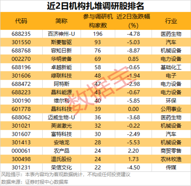 近两个交易日(2月27日至3月2日)共有59家公司公告机构调研记录,其中,百济神州-U、斯菱智驱、容知日新等5股有超50家机构扎堆调研,百济神州-U最受关注,有196家机构调研。