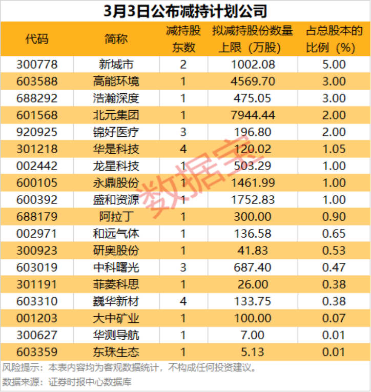 统计显示,今日共18家公司公告减持计划,拟减持比例居前的有新城市、高能环境、浩瀚深度等。