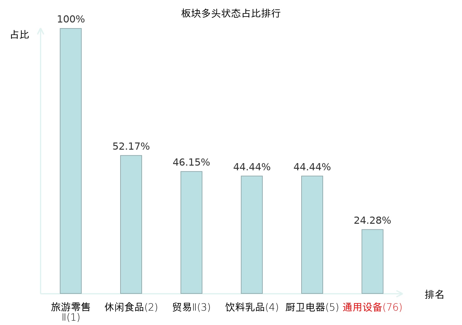 全市场所有行业板块中主力多头状态占比排名中,旅游零售Ⅱ板块位居第一。乘用车板块名次提升最快,较昨日上升91位。