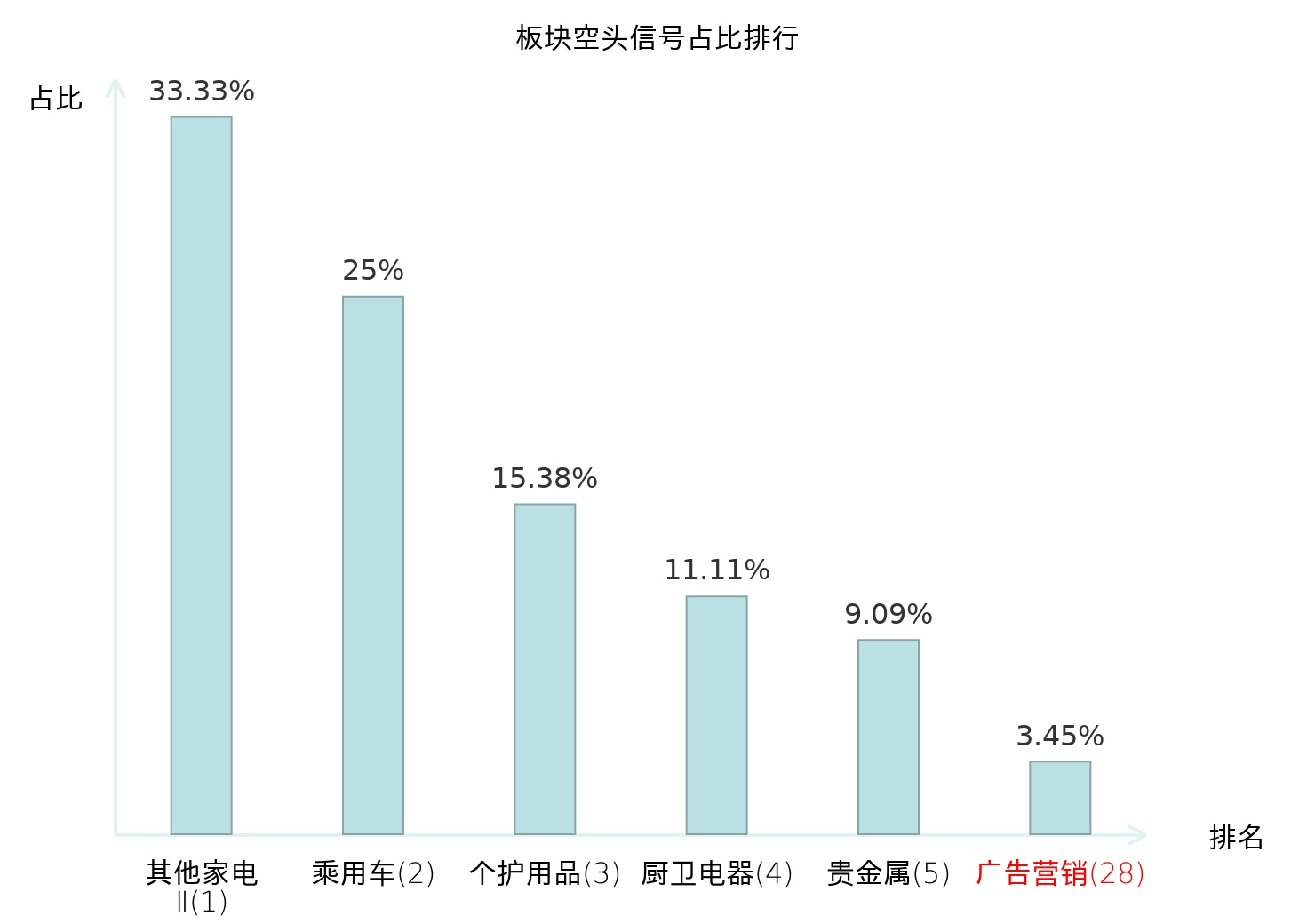 全市场所有行业板块中主力空头信号占比排名中,其他家电Ⅱ板块位居第一。个护用品板块名次提升最快,较昨日上升119位。