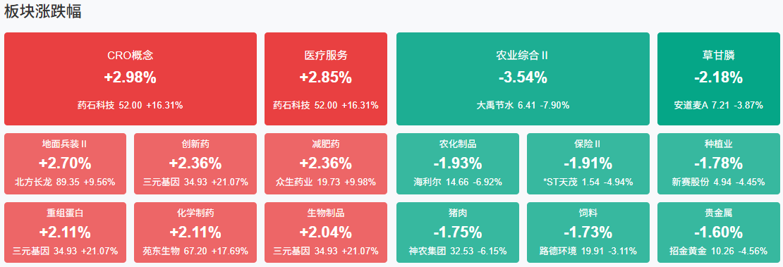 板块方面,CRO、创新药、半导体、CPO等板块涨幅居前,农药、农业、保险、猪肉等板块跌幅居前。截至收盘,沪指跌0.08%,深成指跌0.04%,创业板指涨0.92%。