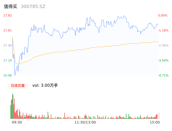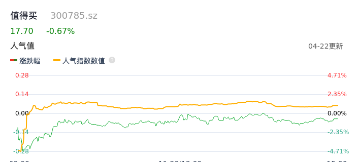 04月22日,值得买收报17.70,股价涨幅-0.67%,成交金额5231.11万元,换手率2.63%。