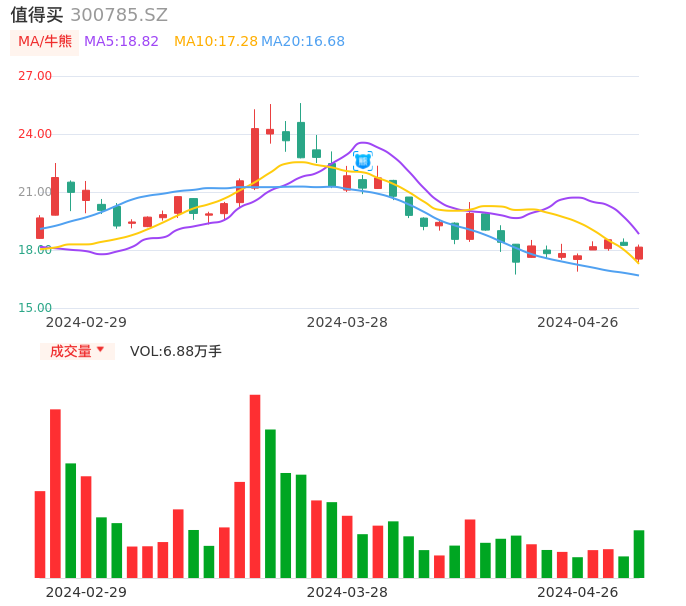 04月26日,值得买收报18.15,股价涨幅-0.49%,成交金额1.23亿元,换手率6.04%。