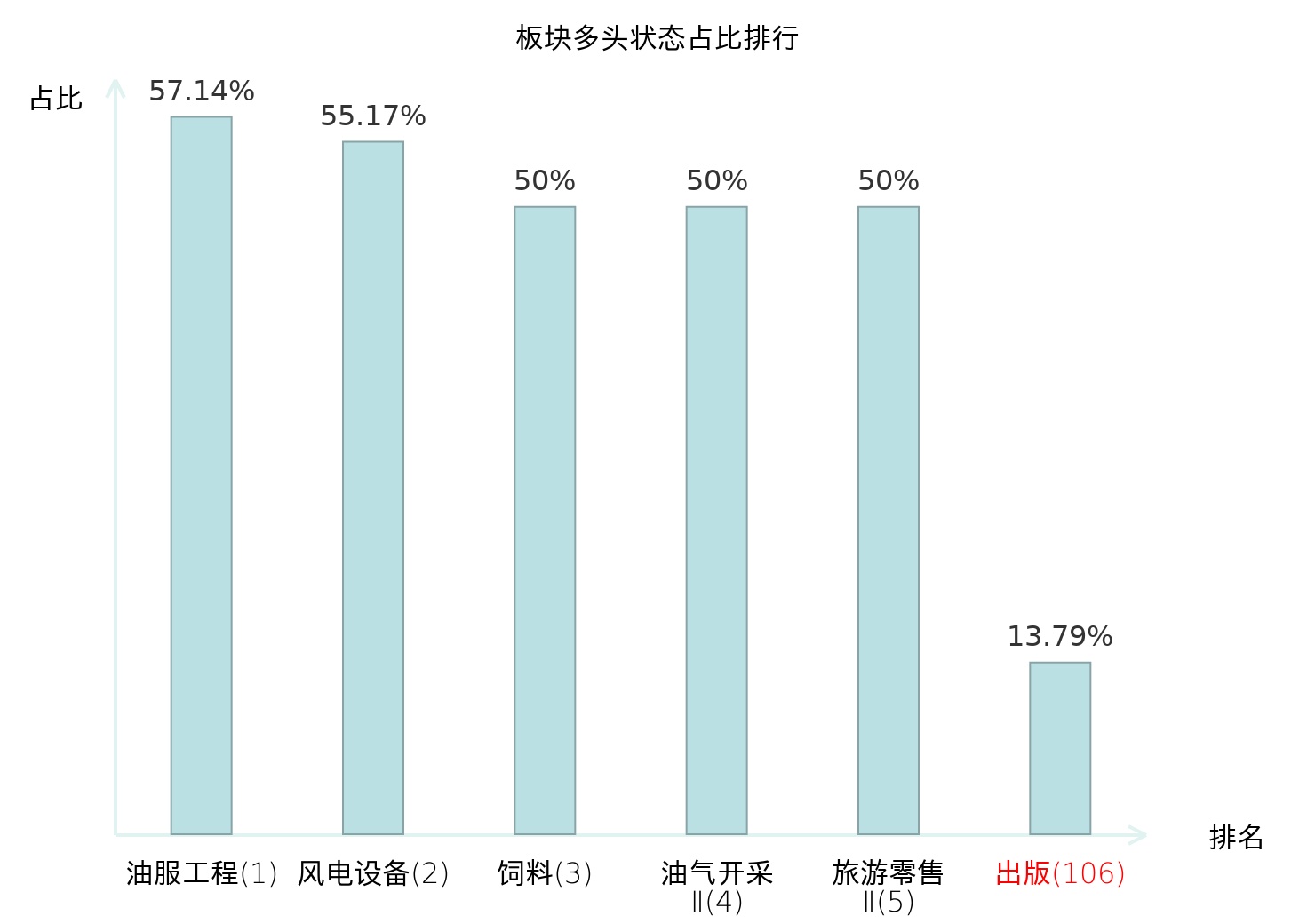 全市场所有行业板块中主力多头状态占比排名中,油服工程板块位居第一。非金属材料Ⅱ板块名次提升最快,较昨日上升67位。
