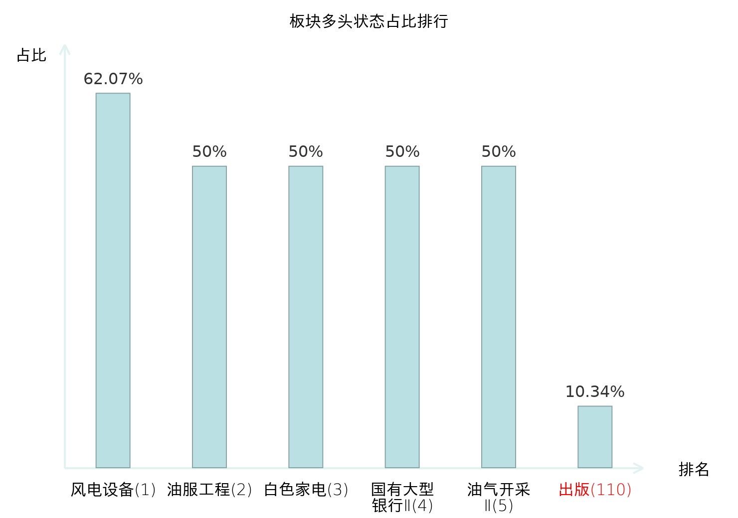 全市场所有行业板块中主力多头状态占比排名中,风电设备板块位居第一。动物保健Ⅱ板块名次提升最快,较昨日上升64位。