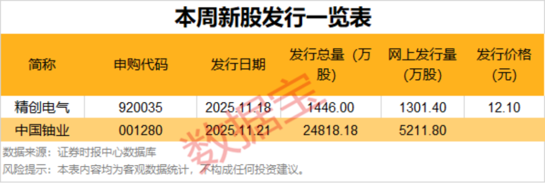 根据发行安排,本周暂有2只新股申购,本周二可申购精创电气,本周五可申购中国铀业。