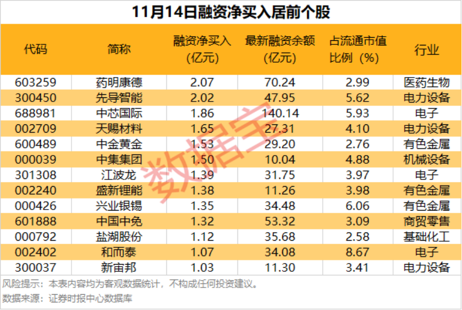 具体到个股,11月14日获融资净买入千万元以上的有377只,其中13只融资净买入额超1亿元。药明康德融资净买入额居首,当日净买入2.07亿元;其次是先导智能、中芯国际,融资净买入金额分别为2.02亿元、1.86亿元;融资净买入金额居前的还有天赐材料、中金黄金、中集集团等。