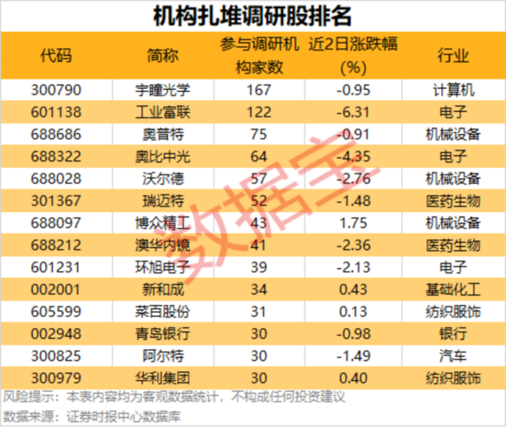 近两个交易日(11月13日至11月14日)共有107家公司公告机构调研记录,其中,6家公司有50家以上机构扎堆调研,宇瞳光学、工业富联较受关注,分别有167家、122家机构调研。