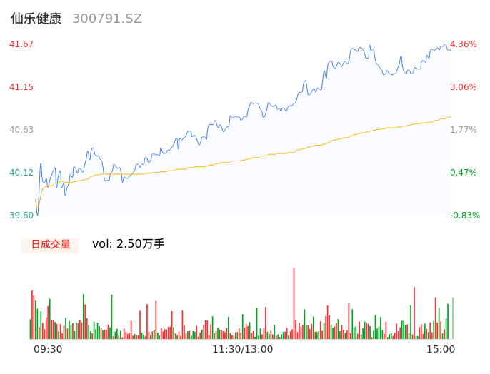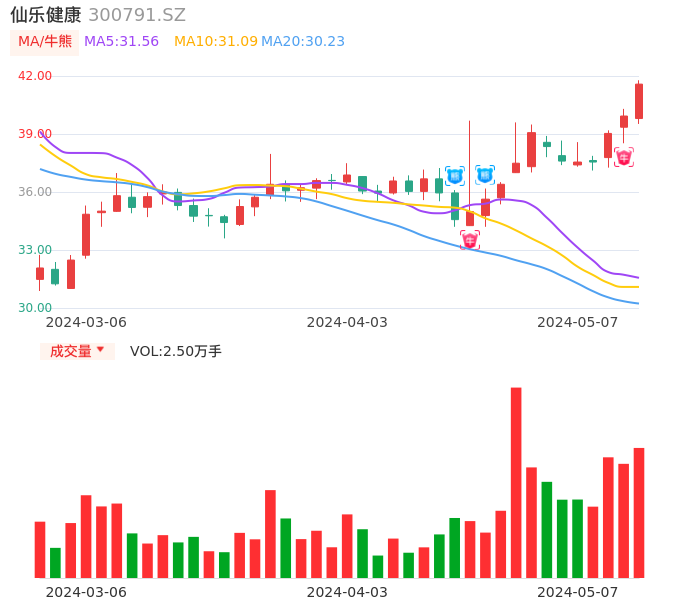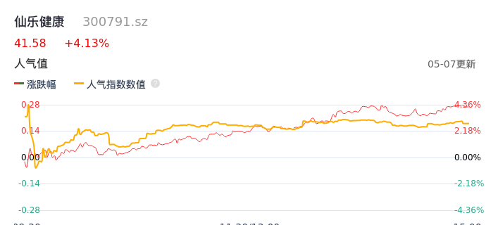 05月07日,仙乐健康收报41.58,股价涨幅4.13%,成交金额1.02亿元,换手率1.67%。