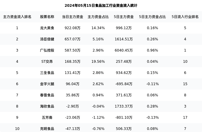 从主力资金流向来看,食品加工行业今日主力资金流入3.97亿元,在所有申万二级行业中排名:97/131。
