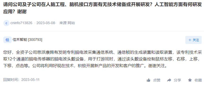 佳禾智能在互动易披露,公司全资子公司思派康拥有发明专利脑电波采集通信系统、通信帧的生成装置和读取装置,该专利技术采取12个通道的脑电传感器的脑电波头戴设备,可用于游戏等领域。