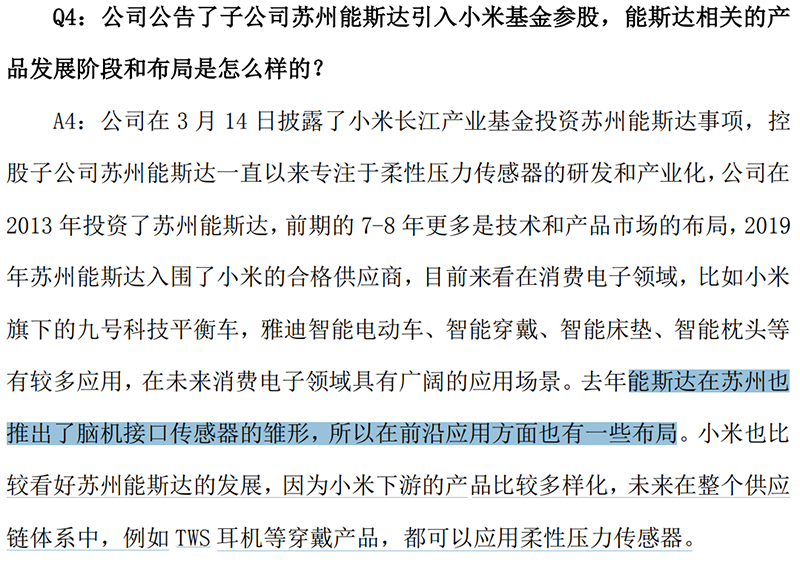 汉威科技在2022年3月接受机构调研时披露,公司在2013年投资了苏州能斯达,去年(2021年)能斯达在苏州也推出了脑机接口传感器的雏形,所以在前沿应用方面也有一些布局。