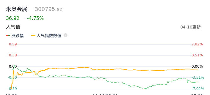 04月10日,米奥会展收报36.92,股价涨幅-4.75%,成交金额1.01亿元,换手率3.09%。