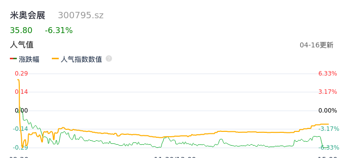 04月16日,米奥会展收报35.80,股价涨幅-6.31%,成交金额7583.32万元,换手率2.37%。