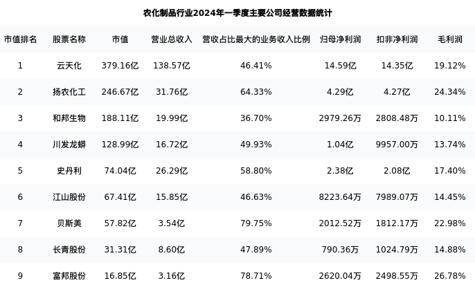 贝斯美最新报告期数据为一季度,下表汇总了农化制品行业内市值靠前的公司一季度主要经营数据