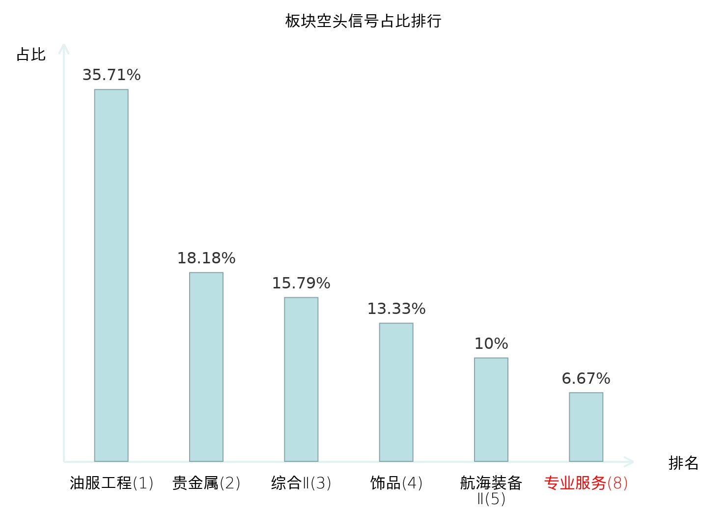 全市场所有行业板块中主力空头信号占比排名中,油服工程板块位居第一。油服工程板块名次提升最快,较昨日上升108位。