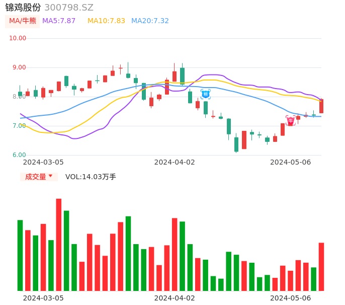 05月06日,锦鸡股份收报7.91,股价涨幅7.47%,成交金额1.08亿元,换手率3.79%。