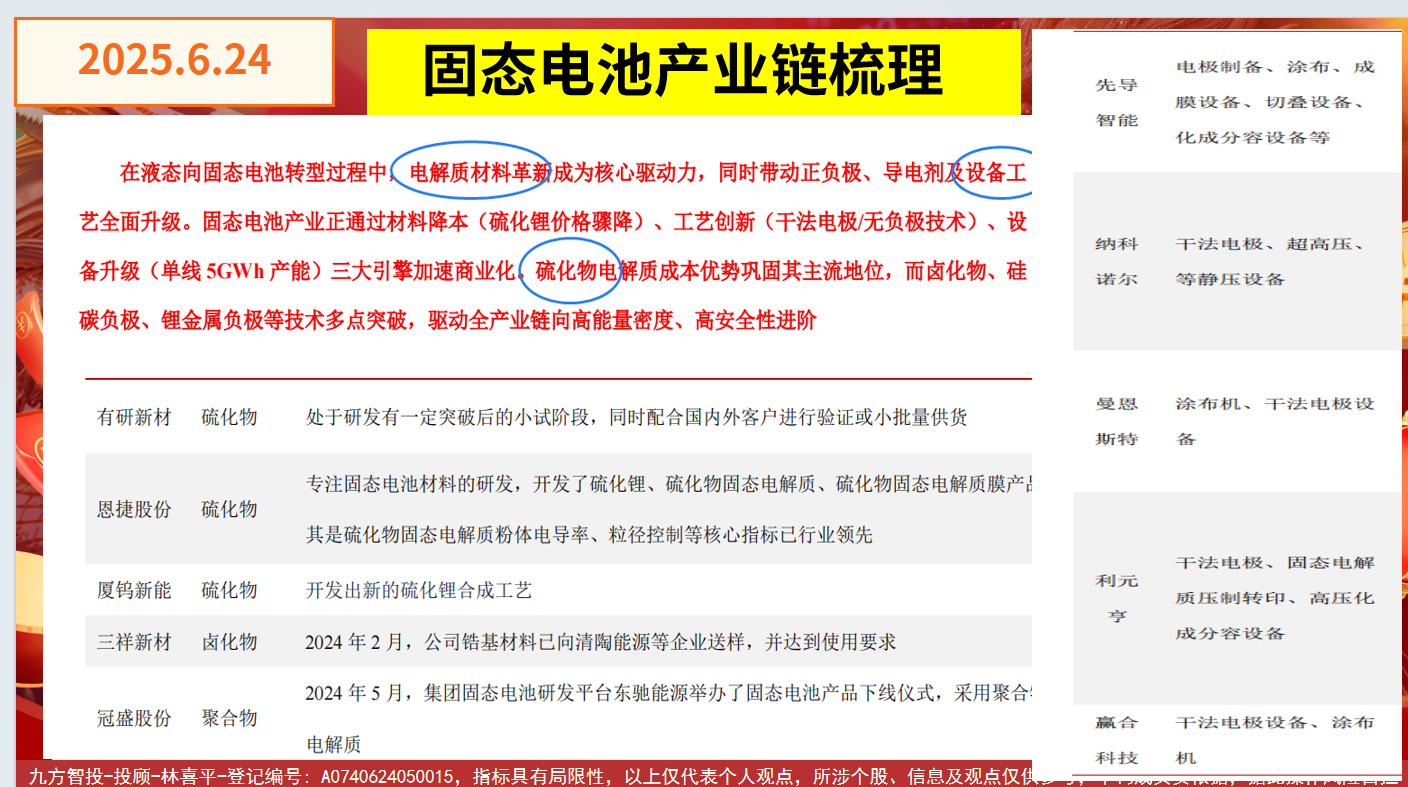 2、题材演绎方向,固态电池集团高潮,该产业链重在增量方向,——多留意硫化物电解质和上游设备端。相关公司如下: